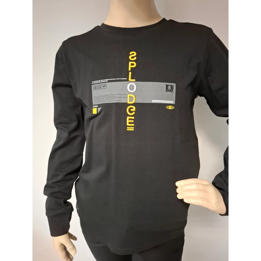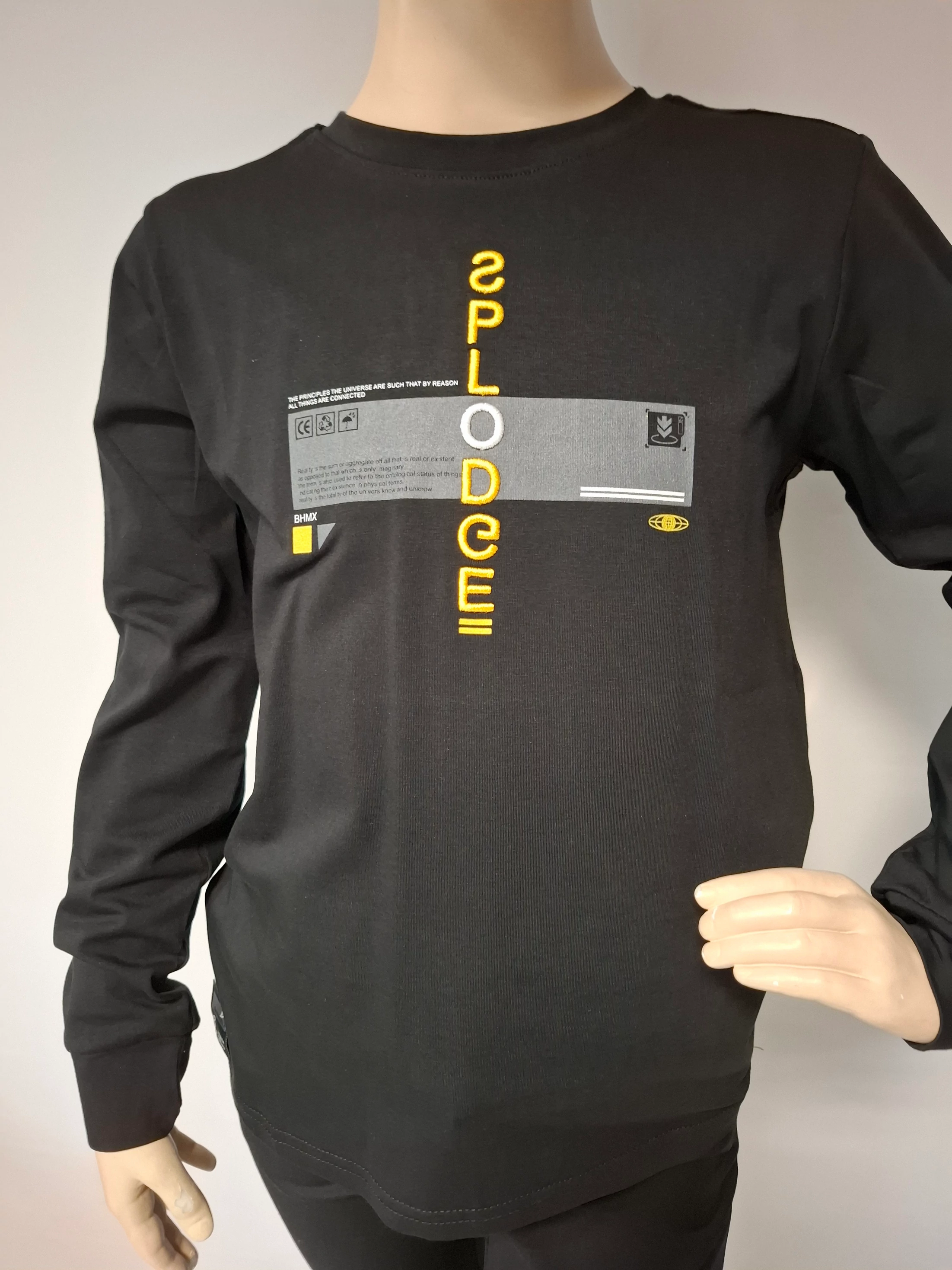 Fekete hosszú ujjú fiú póló – rugalmas pamut, filmnyomással és hímzéssel